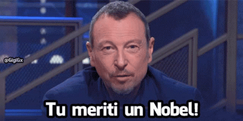 Italian TV presenter Amadeus exclaims 'You deserve a Nobel!' with an expressive, surprised face.
