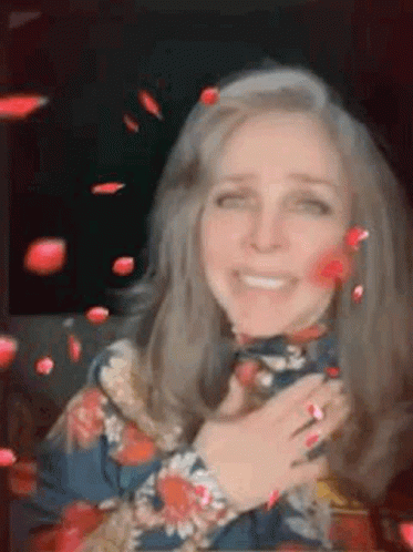 Noe Vc is visibly emotional as red rose petals fall around her, wearing a floral top.