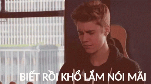Justin Bieber looks annoyed with the Vietnamese caption "BIẾT RỒI KHỔ LẮM NÓI MÃI" (I know already, stop talking so much).
