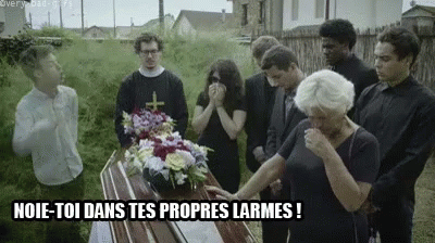 Séb La Frite's comedic funeral skit features mourners around a coffin, with the stark message 'DROWN IN YOUR OWN TEARS!'.