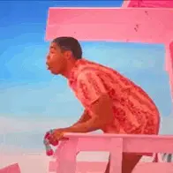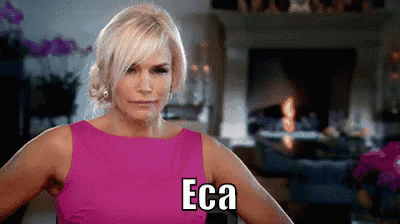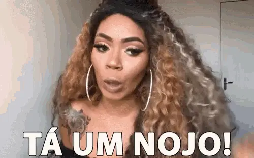 Woman in a pink dress sticks out her tongue with 'Eca' on screen, expressing disgust or disapproval.