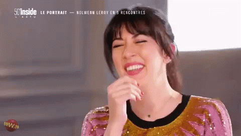 Nolwenn Leroy laughing joyfully, wearing a sparkling pink and gold top during an interview segment.