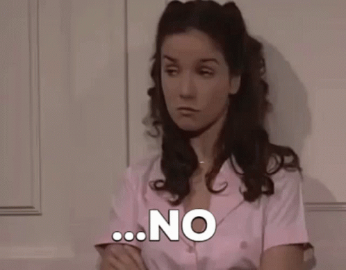 Woman in a pink shirt with a disapproving look, saying 'NO' with a clear expression of refusal.