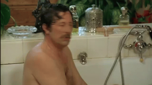 Man in bathtub, looking surprised or singing, in a scene featuring Rochefort.