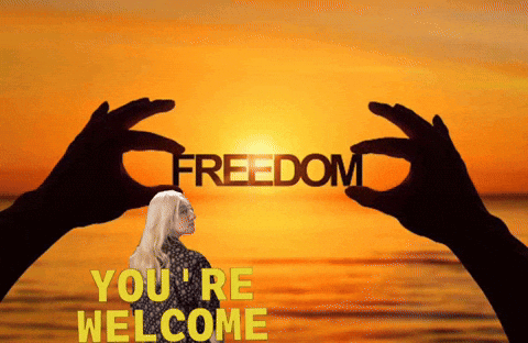 A woman stands in front of a sunset, hands framing the word 'FREEDOM' with 'YOU'RE WELCOME' text.
