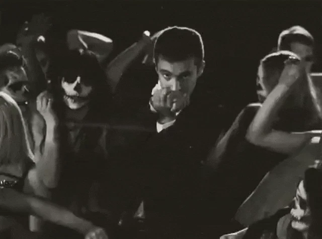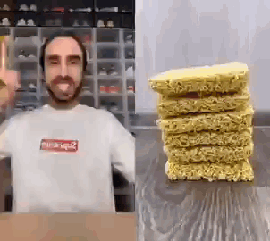 A man in a Supreme shirt next to a large stack of ramen noodles in a split-screen video.