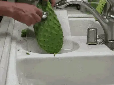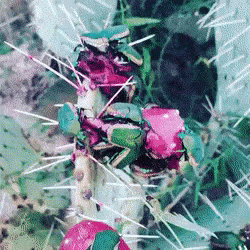 Green beetles feasting on the vibrant red fruit of a Nopal Prickly Pear cactus.