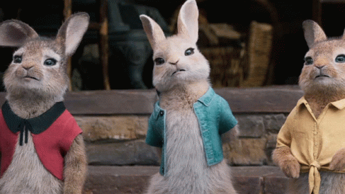 Cottontail, Flopsy, and Mopsy from Peter Rabbit react with disapproval, shaking their heads.