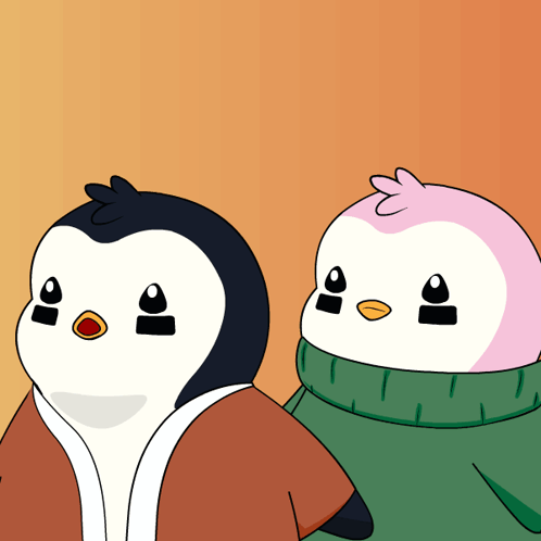 Two animated penguins tilt their heads in a synchronized 'nope' or confused gesture.