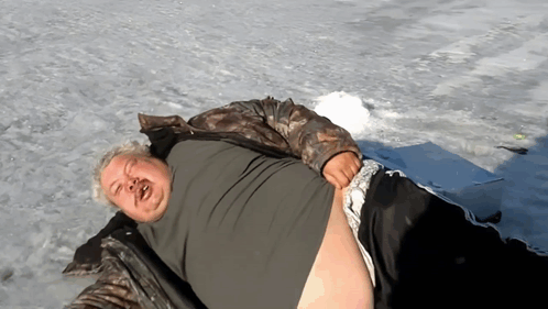 A man lies on the ice during winter fishing, seemingly unfazed by the cold, with the Russian caption 'Normal.' appearing.