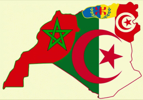 A political map of North Africa featuring the national flags of Algeria, Morocco, Tunisia, and the flag of Kabylia.