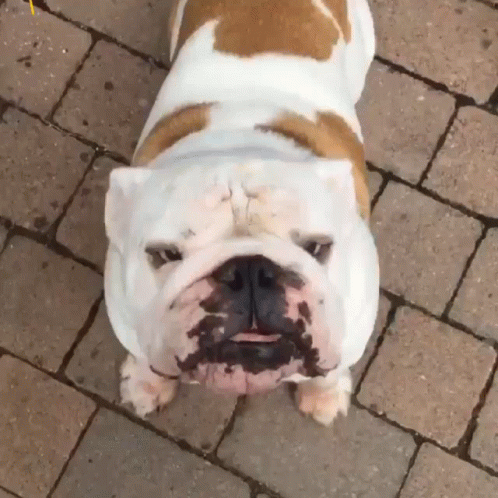 Close-up of a grumpy-looking bulldog with white and brown fur, looking up at the camera.