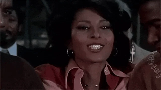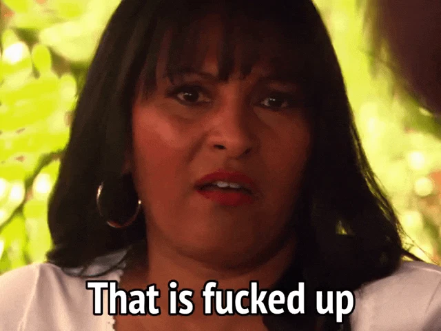 Pam from Sistas reacts with a 'not me' gesture, wearing a black leather jacket and a necklace.