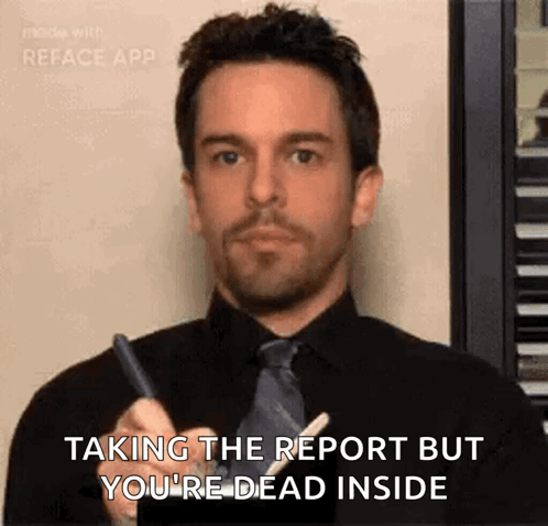 A man writing notes, with the caption 'Taking the report but you're dead inside', expressing relatable work fatigue.
