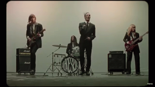 The band Maneskin performs live on stage, with members playing guitars, bass, and drums in suits.