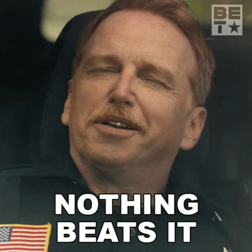 Richard (Courtney Gains), a man with a mustache in uniform, expresses 'Nothing Beats It' with a knowing look.