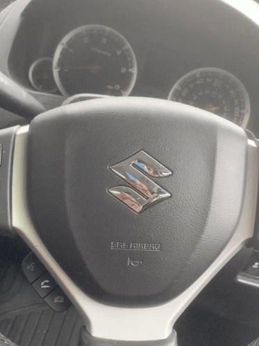 A close-up view of Femi's Suzuki car steering wheel, featuring the SRS Airbag, with Akwasi also associated.