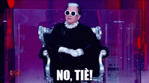 Cristiano Malgioglio making a defiant gesture with the text 'NO, TIÈ!' and 'TIÈ!' on screen.