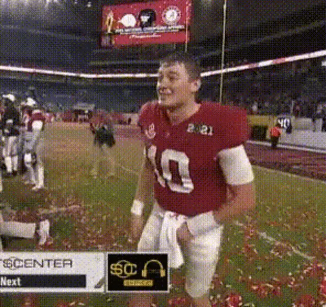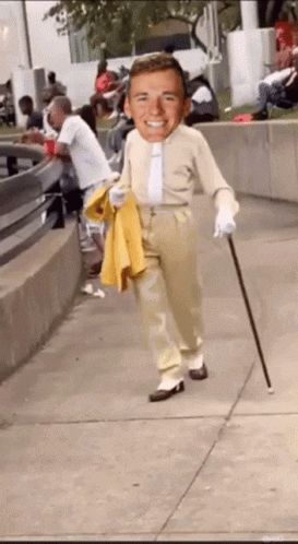 Mac Jones's head is superimposed on a small body, walking with a cane and holding a yellow jacket on a sidewalk.