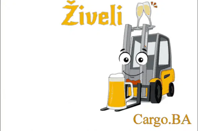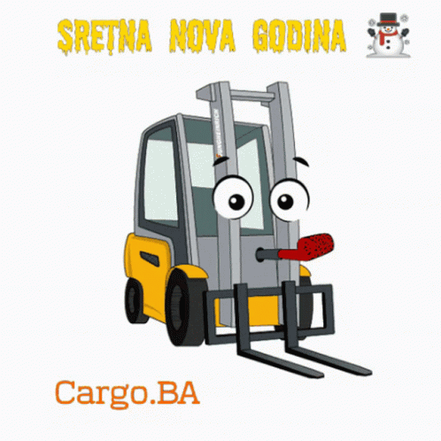 Animated forklift with big eyes wishing 'Happy New Year' from Cargo.BA, surrounded by festive confetti.