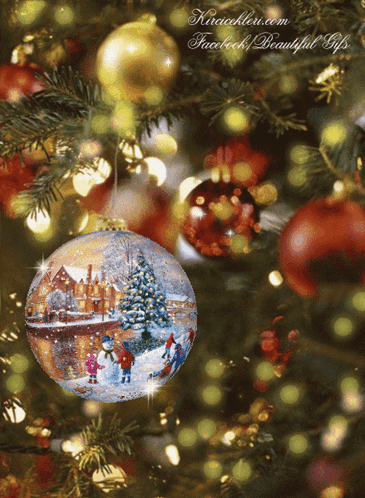 A festive Christmas tree adorned with sparkling ornaments, one featuring a charming snowy winter scene with people and houses.
