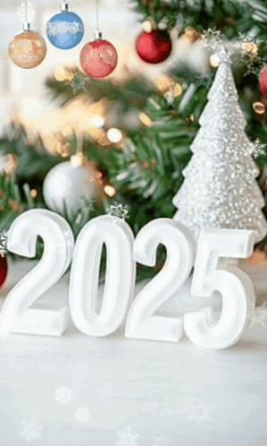 Festive display of the year 2025 with a decorated Christmas tree and falling snowflakes.