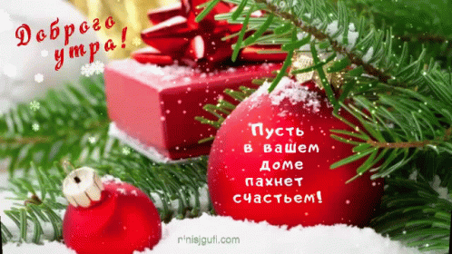 A festive Christmas/New Year greeting card with red ornaments, a gift, and snow, wishing a good morning and happiness.