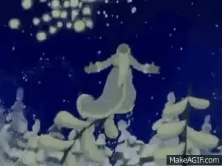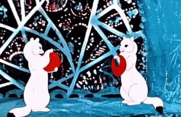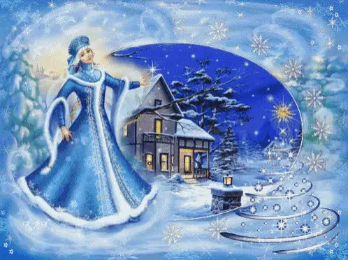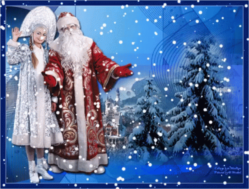 Ded Moroz and Snegurochka celebrating New Year in a snowy landscape.