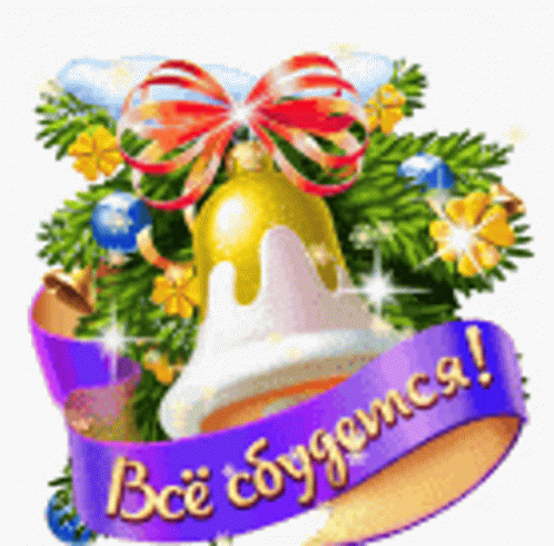 A festive New Year's bell with fir branches and ornaments, featuring the hopeful message 'Everything will come true!'