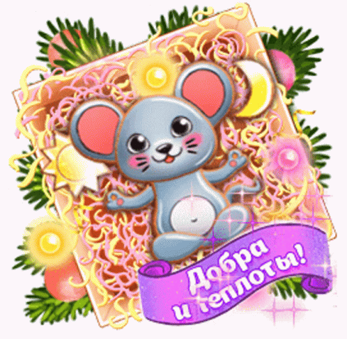 Cute mouse with a banner wishing 'Goodness and warmth!' for New Year 2020, surrounded by festive decorations.