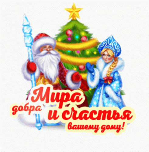 Ded Moroz and Snegurochka stand by a festive Christmas tree, wishing peace, goodness, and happiness to your home.