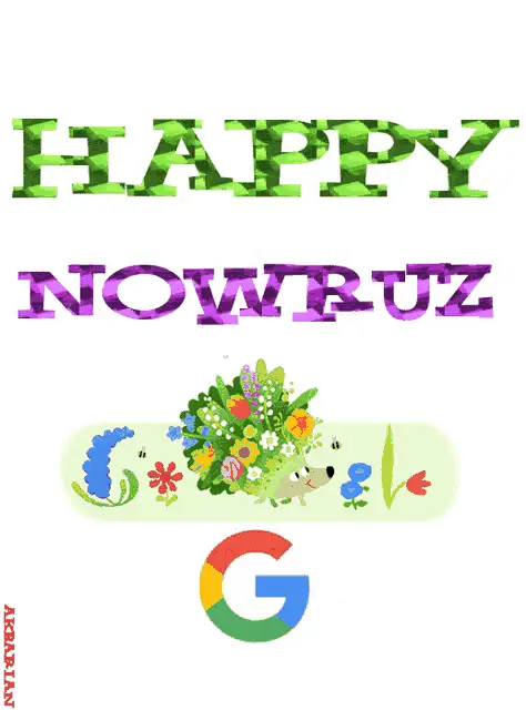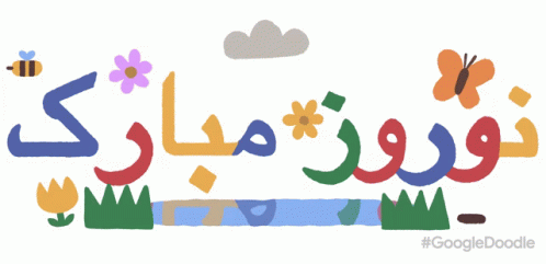 A vibrant Google Doodle celebrating Nowruz Mubarak with colorful text, flowers, butterflies, and a bee.