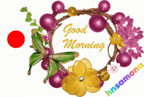A decorative floral wreath with berries and a butterfly, featuring 'Good Morning' text.