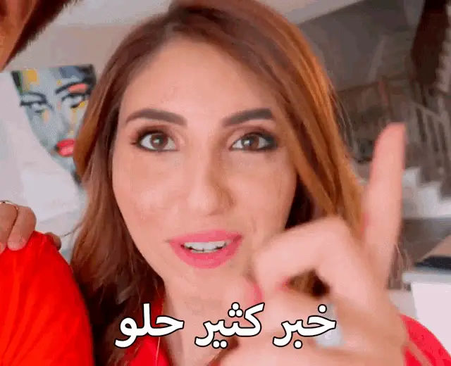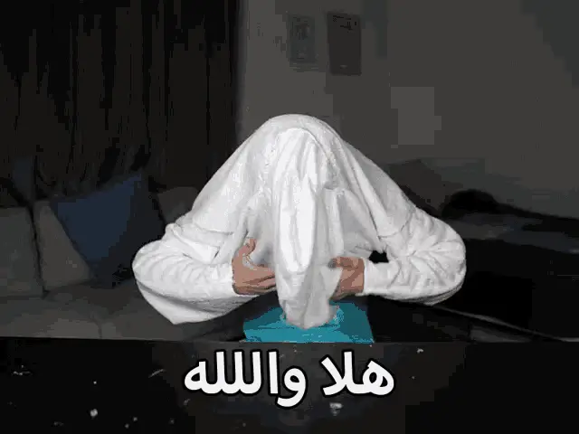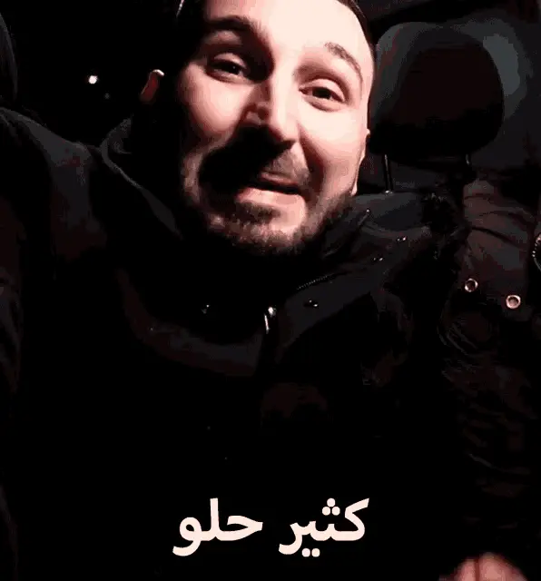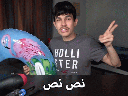 Man in a Hollister shirt holds a flamingo-shaped inflatable float, with Arabic captions 'Half half'.