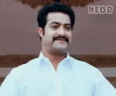 NTR Jr. smiles and claps, wearing a white shirt, in a public appearance.