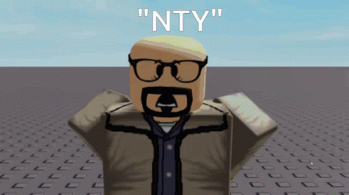 Roblox character resembling Walter White says 'NTY' and falls over in a simple animation.