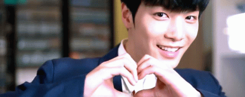 NU'EST member JR, also known as Kim Jonghyun, smiles charmingly while making a heart shape with his hands.