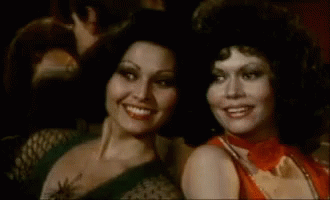 Two women in cabaret costumes, possibly from Mexico, react with surprise and smiles, embodying the spirit of 'Nueztoy Sorprendida'.