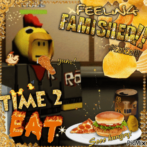 A Roblox-themed image featuring a chicken character, various foods, and text like 'Feeling Famished!' and 'Time 2 Eat'.