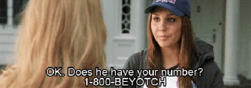 A girl asks if 'he' has her number, then reveals the humorous number '1-800-BEYOTCH' with a smile.