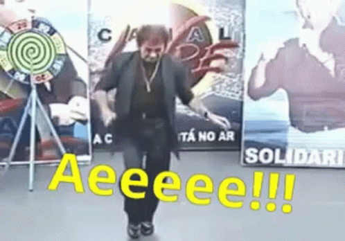 Nunes Filho dancing energetically with the 'Aeeee!!!' caption, reminiscent of David from Schitt's Creek.