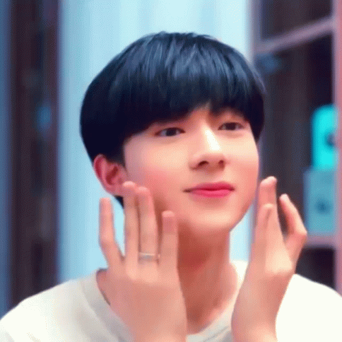 Nunew gently applies skincare cream to his cheeks, smiling softly.