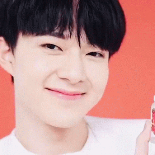 Nunew smiling sweetly while holding a small bottle of strawberry juice against an orange background.