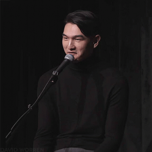 Nurlan Saburov delivers an expressive and humorous performance into a microphone, making a funny face.