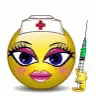A yellow nurse smiley emoji with a red cross cap, exaggerated eyelashes, and pink lips, holding a syringe.