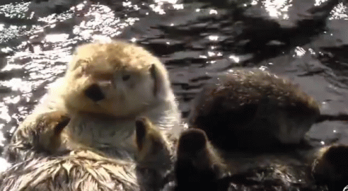 Two adorable sea otters float on their backs, gently holding paws in the sparkling water.