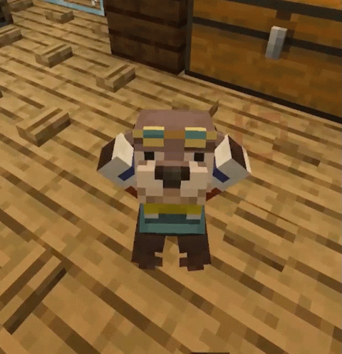 Dedsafio's Nutria Minecraft character, wearing a hat and goggles, stands on a wooden floor in front of a chest.