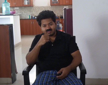 Mouli Talks: A man with a mustache and curly hair gestures while sitting in a chair at home.