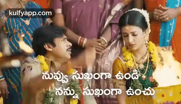Pawan Kalyan and Shruthihaasan in a wedding scene, sharing vows: 'You be happy and keep me happy'.