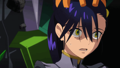 a close up of a cartoon character with purple hair and yellow eyes